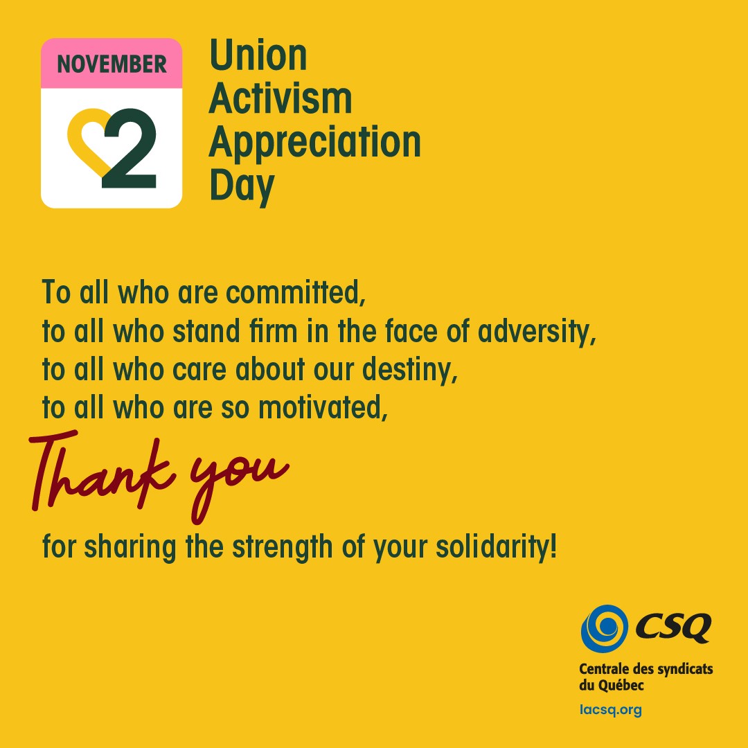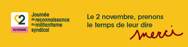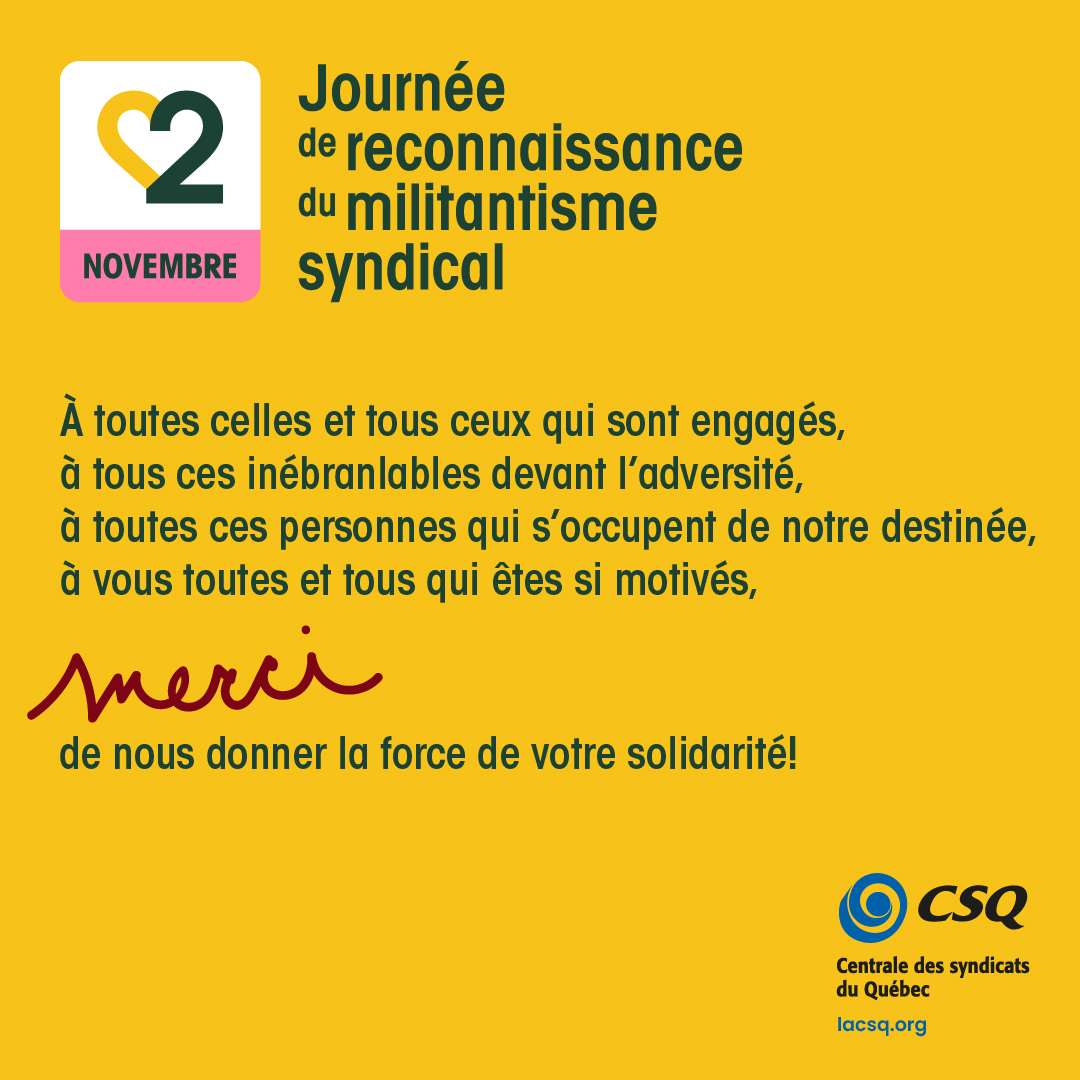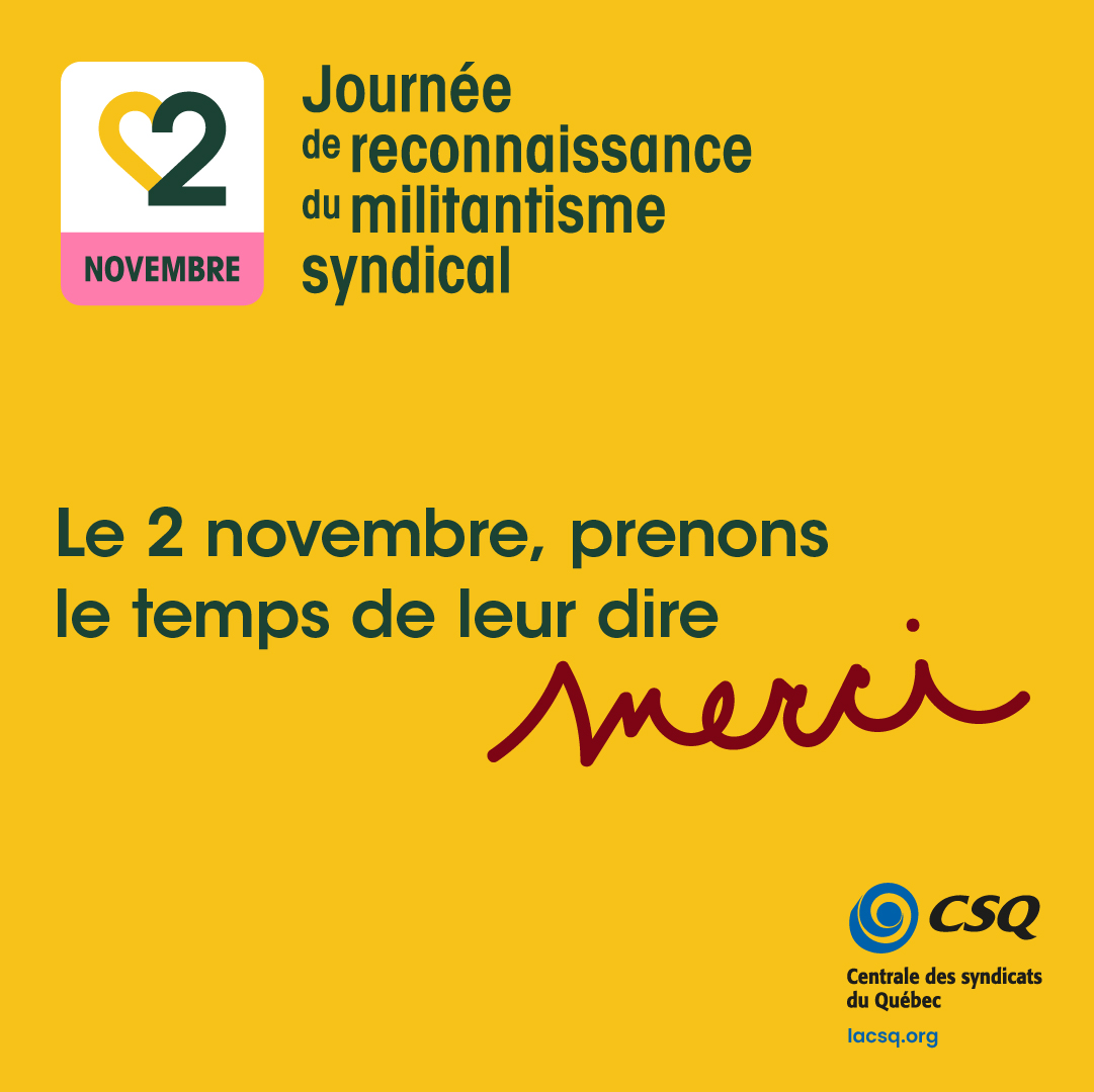 Soulignons la Journée de reconnaissance du militantisme syndical afin de reconnaître l’apport des militantes et militants au sein de notre centrale, la CSQ. Une initiative mise en place suite à l’adoption d’une motion par les personnes déléguées au Congrès de 2021. C’est pourquoi, le 2 novembre prochain, nous rendrons hommage à toutes ces personnes engagées dans la défense et le développement de nos conditions de travail ainsi que dans la vitalité de notre société. C’est grâce à toutes ces militantes et tous ces militants que nous parvenons à des gains, que nous protégeons nos acquis et que nous remportons des luttes.