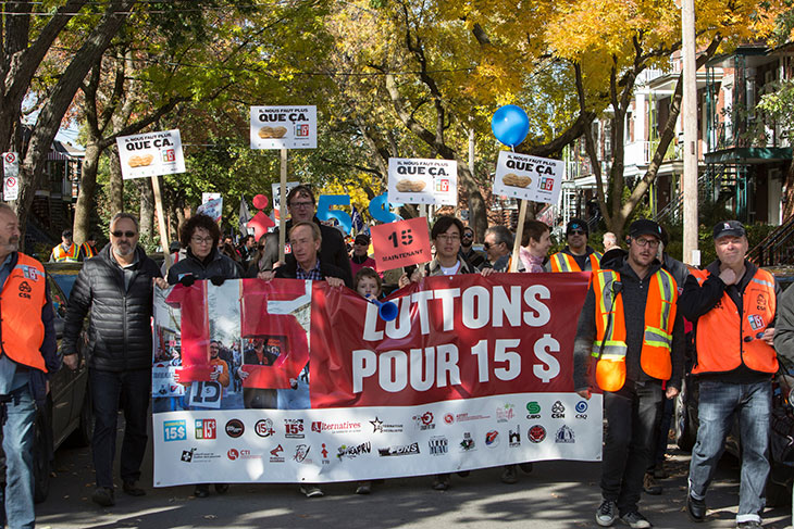 Mentionnons d’ailleurs que de nombreux membres de la CSQ ont pris part à la manifestation organisée samedi à Montréal pour un salaire minimum à 15 $ de l’heure. Notre présidente a notamment réitéré qu’il n’est pas normal, en 2016 au Québec, que des personnes travaillant à temps plein au salaire minimum actuel vivent sous le seuil de la pauvreté.