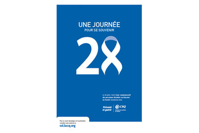 Dans le cadre du 28 avril, les citoyennes et les citoyens sont invités à porter un ruban ou un brassard noir. Quant à elle, la CSQ met les drapeaux en berne devant ses édifices de Québec et de Montréal et demande que soit observée une minute de silence lors de ses instances, comités ou réseaux qui sont en réunion un 28 avril. Elle invite également ses organisations affiliées à faire de même.