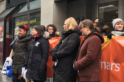 Montréal, le 8 mars 2018. – Pour souligner la Journée internationale des femmes, plusieurs dizaines de manifestantes et manifestants ont pris part à une double action qui s’est tenue devant les bureaux du ministère de la Santé et des Services sociaux et de l’agence de placement Thomson Tremblay à Montréal.