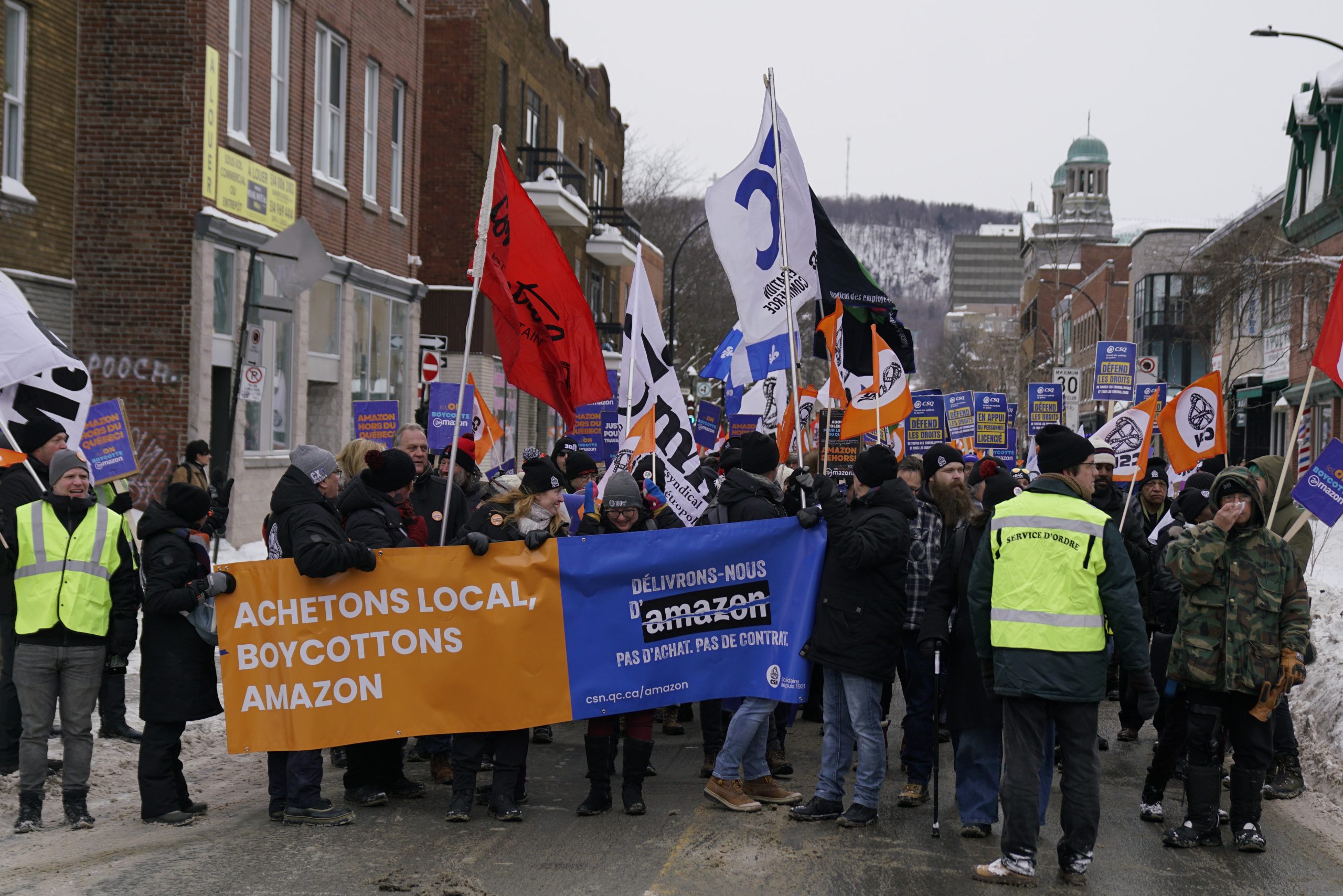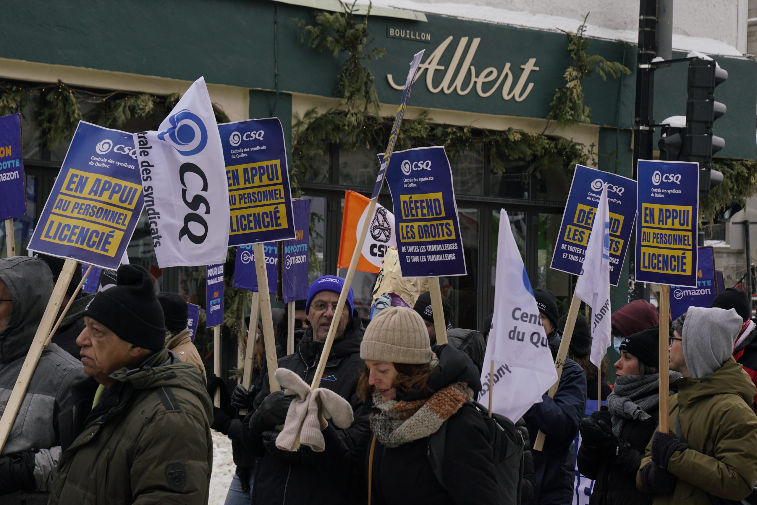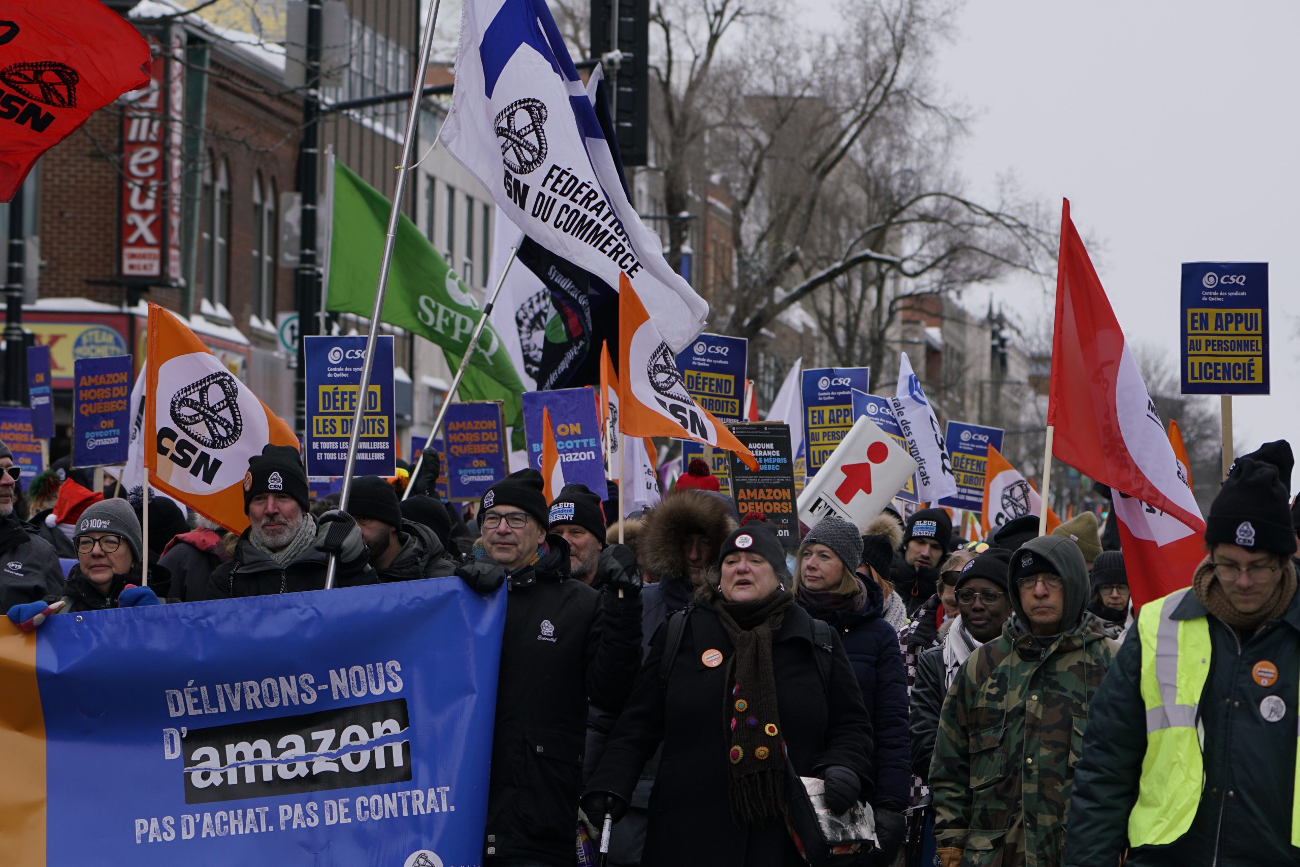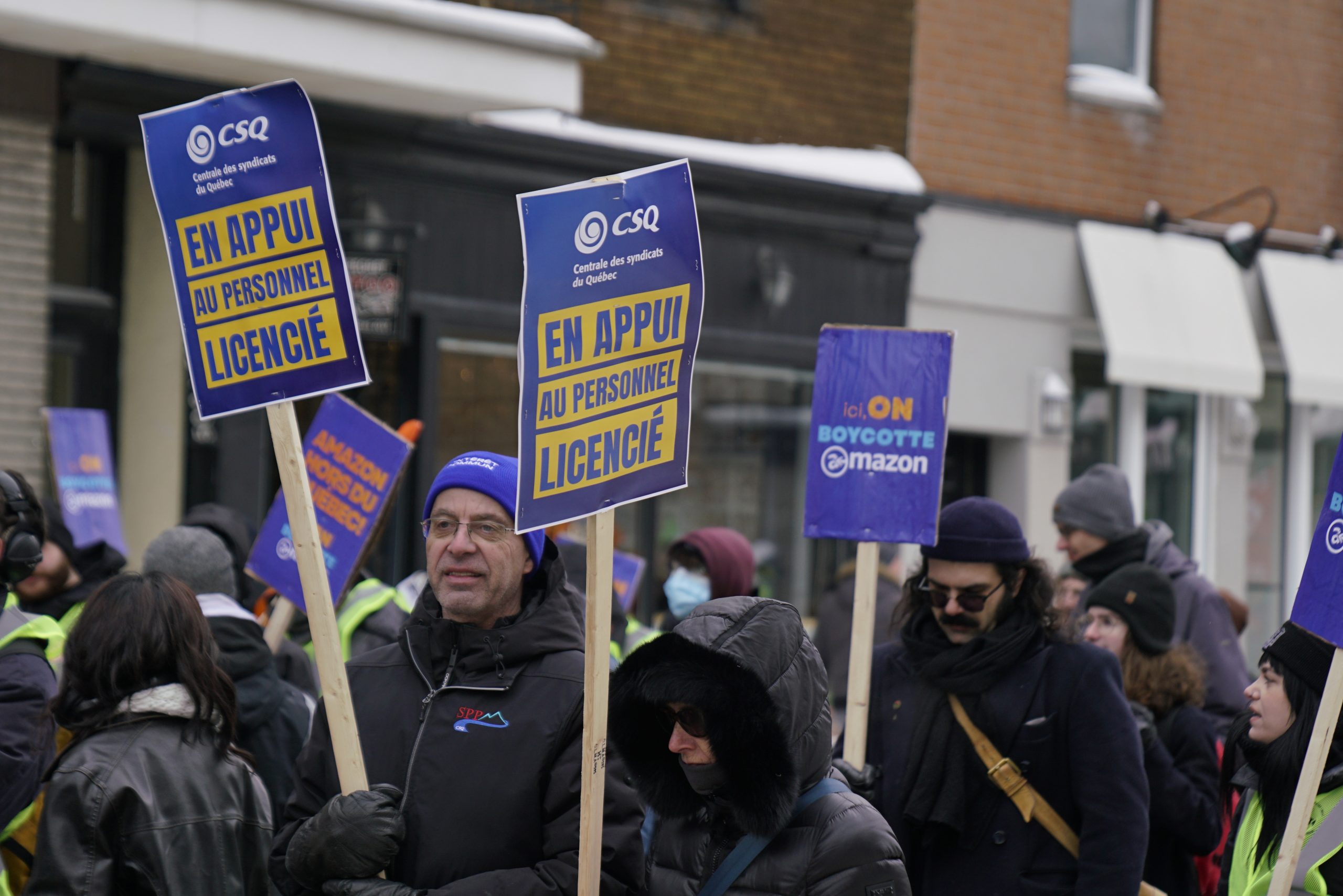 Dans une magnifique démonstration de solidarité, l’ensemble des organisations syndicales du Québec ont répondu à l’appel de la Confédération des syndicats nationaux (CSN) pour soutenir les travailleuses et travailleurs licenciés par Amazon. La CSQ y était.