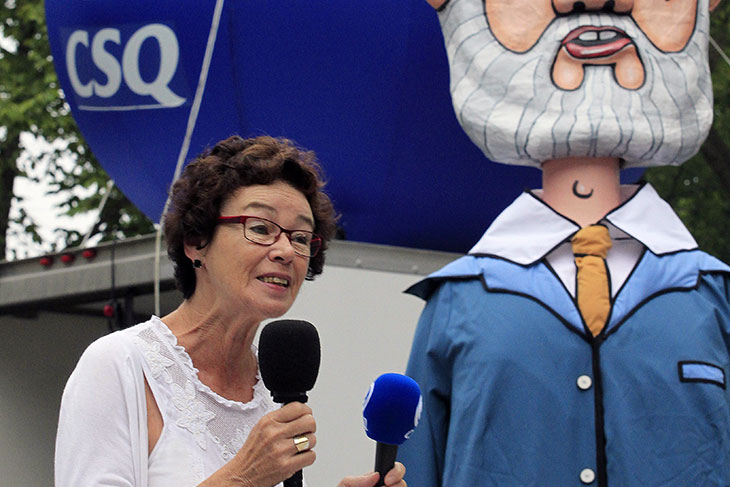 « On remarque que depuis son arrivée au pouvoir, le gouvernement de Philippe Couillard s’est fait le champion du déficit zéro à tout prix, et ce, même au prix du bien-être de la population. Avec toutes les compressions et les coupes au sein de l’ensemble des réseaux publics, les Québécoises et Québécois doivent maintenant faire face à des augmentations de tarifs et à une diminution importante des services. Comment ce gouvernement compte-t-il relancer le Québec alors que ces mesures d’austérité causent l’appauvrissement de la population ? Comment celle-ci peut-elle retrouver espoir dans ce contexte de morosité ? Comment le gouvernement envisage-t-il de reconnaitre le travail des employés de l’État ? », questionne Louise Chabot, présidente de la CSQ.