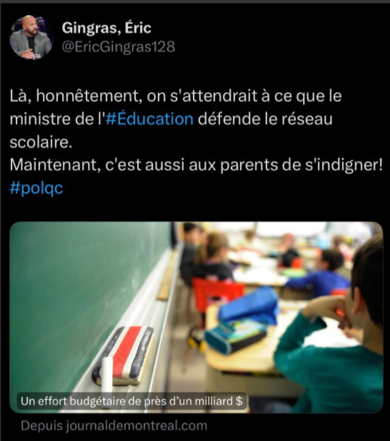 « Le ministre Bernard Drainville affaiblit le réseau scolaire au lieu de le renforcer. Il impose des mesures d’austérité qui minent les services aux élèves. La Fédération du personnel de soutien scolaire dénonce ces compressions et exige un changement immédiat de cap. Il faut des investissements concrets dans les services et un vrai respect envers le personnel de soutien. Nos écoles tombent en ruine et on continue de couper dans les ressources. Le gouvernement gère en fonction des budgets, pas des besoins humains. Ça suffit l’hypocrisie! » – Éric Pronovost, président de la Fédération du personnel de soutien scolaire (FPSS-CSQ).