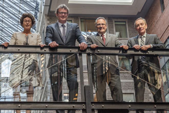 Les porte-parole des centrales se sont adressés aux médias avant de rencontrer les représentants de la commission. Il s’agit de François Vaudreuil, président de la CSD, Jacques Létourneau, président de la CSN, Louise Chabot, présidente de la CSQ, et Daniel Boyer, président de la FTQ.