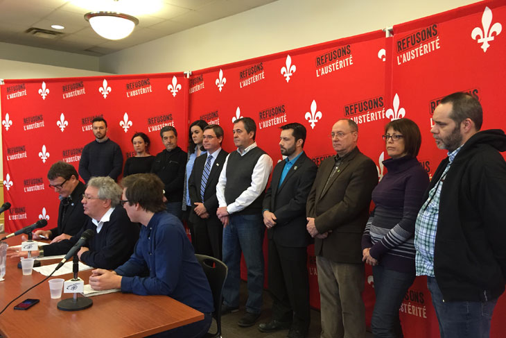 Le gouvernement libéral de Philippe Couillard a imposé un vaste programme d’austérité pour lequel il n’a pas été élu en avril 2014. Prétextant une situation catastrophique, le gouvernement Couillard fait adopter des réformes importantes et durables qui accroîtront le rôle du secteur privé dans des secteurs publics comme la production d’électricité, la propriété et l’opération des infrastructures de transport, les services de garde éducatifs, l’éducation et les soins de santé. Ce prétexte lui permet également de s’attaquer à une multitude de services qui comptent dans la vie quotidienne de beaucoup de gens, tels que les services de garde offerts aux familles avec de jeunes enfants, le soutien aux personnes handicapées, l’aide aux devoirs, le transport des malades dans les régions éloignées, le soutien aux petites municipalités des régions, les prestations du programme d’aide sociale, etc.