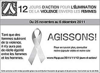 La Campagne des 12 jours d’action pour l’élimination de la violence envers les femmes, coordonnée par la Fédération des femmes du Québec (FFQ), est menée conjointement avec: le comité des femmes des communautés culturelles de la FFQ, la Concertation des luttes contre l’exploitation sexuelle, la Fédération de ressources d’hébergement pour femmes violentées et en difficulté du Québec, la Fédération interprofessionnelle de la santé du Québec – FIQ, Femmes Autochtones du Québec, L’R des centres de femmes du Québec, le Regroupement des maisons pour femmes victimes de violence conjugale, le Regroupement québécois des centres d’aide et de lutte contre les agressions à caractère sexuel – RQCALACS, le Réseau d’action des femmes handicapées du Canada, le Réseau des lesbiennes du Québec et la Table de concertation des organismes au service des personnes réfugiées et immigrantes.