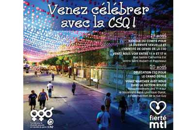Venez rencontrer des membres du Comité pour la diversité sexuelle et l’identité de genre au kiosque de la CSQ le 19 août 2017. Les membres du comité y seront de 11 h à 17 h sur la rue Sainte-Catherine Ouest (entre Saint-Hubert et Papineau).