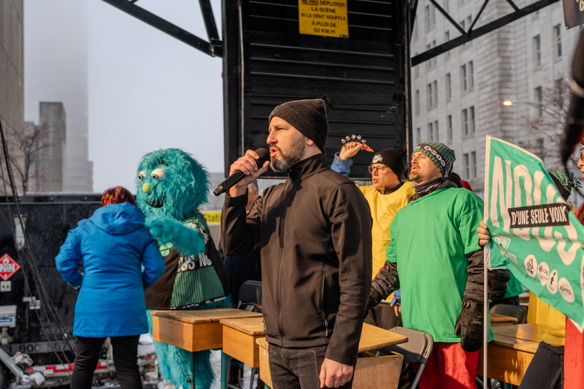 Éric Pronovost a ajouté que la clause de l’indice des prix à la consommation (IPC) est essentielle, car « on ne veut pas s’appauvrir et voir l’écart avec le privé et les autres services publics augmenter encore plus ». Il a ajouté que « la contribution de l’employeur aux assurances collectives doit aussi être augmentée, car cela a un impact important pour nos membres, surtout pour les familles monoparentales. N’oublions pas que le personnel de soutien scolaire représente une personne sur cinq au sein du Front commun ».