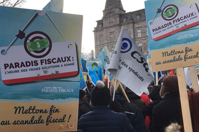 Québec, le 23 novembre 2017. – Le collectif Échec aux paradis fiscaux tient une manifestation aujourd’hui devant le Parlement du Québec afin de réclamer de vraies solutions contre le recours aux paradis fiscaux. Les revendications du collectif trouvent écho au sein de la population québécoise comme en témoignent les résultats d’un sondage commandé par le collectif et rendu public aujourd’hui. « Le sondage, réalisé avant les fuites médiatiques entourant les Paradise Papers, montre que 81 % de la population québécoise souhaite que les gouvernements agissent plus sérieusement contre le recours aux paradis fiscaux. On sent une très forte mobilisation de la population sur ce grave problème et on sait que le gouvernement du Québec et le gouvernement fédéral ont chacun un rôle à jouer dans cette lutte », déclare Isabelle St-Germain, directrice Innovation et développement chez Oxfam-Québec.