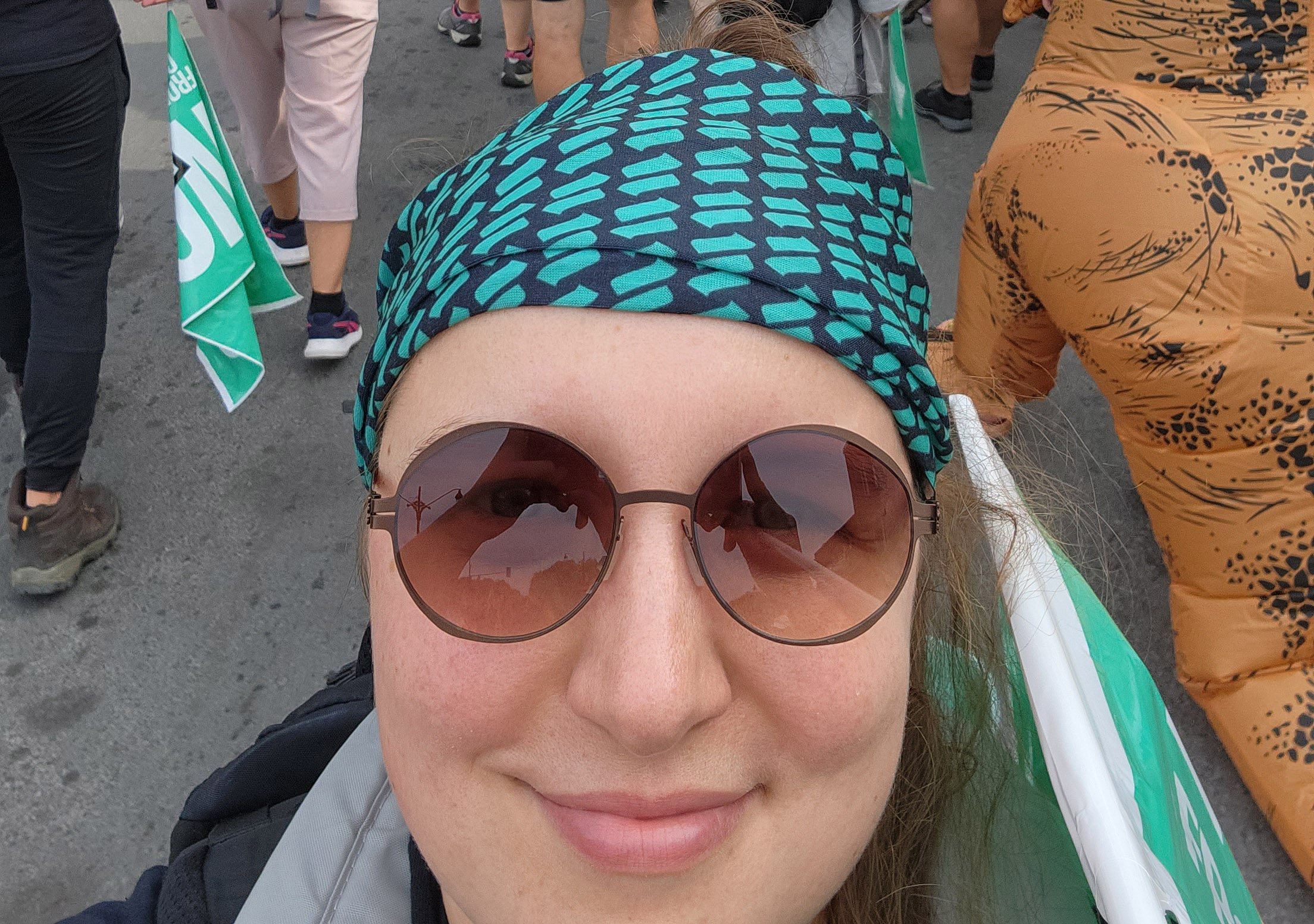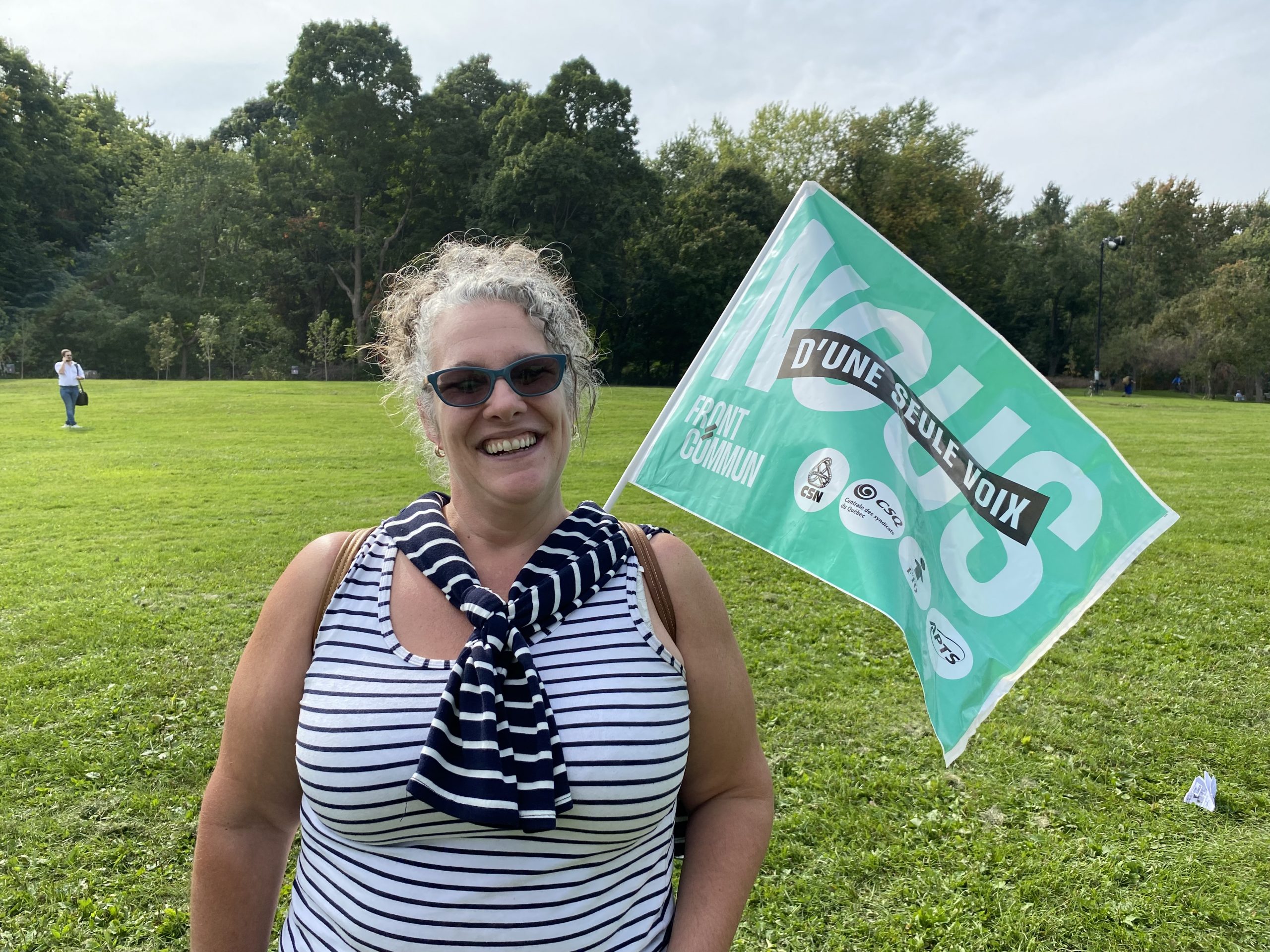 « Je suis là pour militer pour une meilleure reconnaissance des emplois des secteurs de la santé et de l’éducation qui sont à majorité occupés par des femmes. En prenant part à cette marée de monde, nous envoyons un message clair à notre premier ministre : nous sommes nombreuses et nous nous battrons jusqu’au bout pour obtenir ce qui nous est dû, c’est-à-dire un salaire et des conditions de travail décentes qui feront cesser l’exode des travailleuses vers le secteur privé ainsi que l’épuisement de celles qui restent au front. »