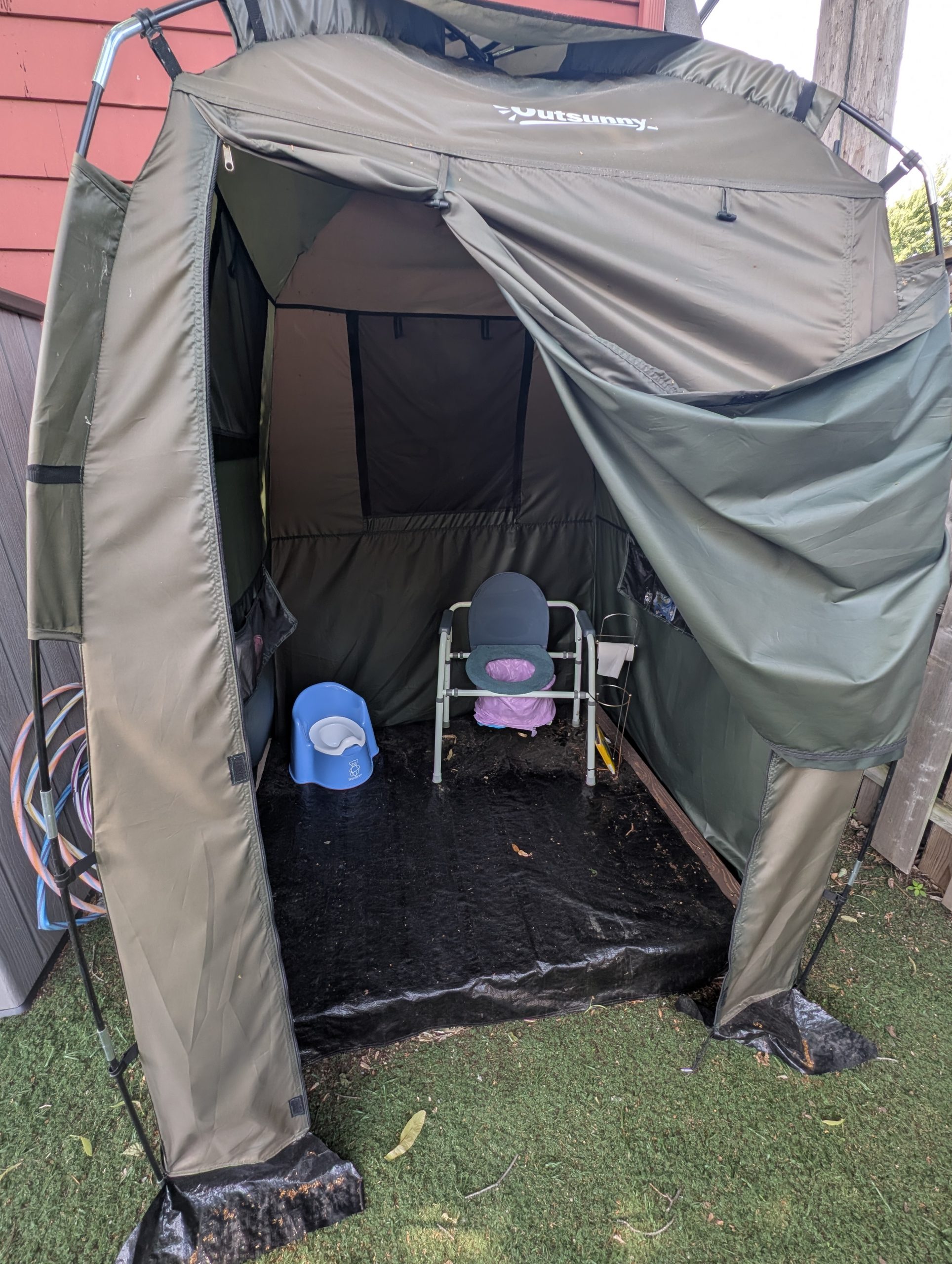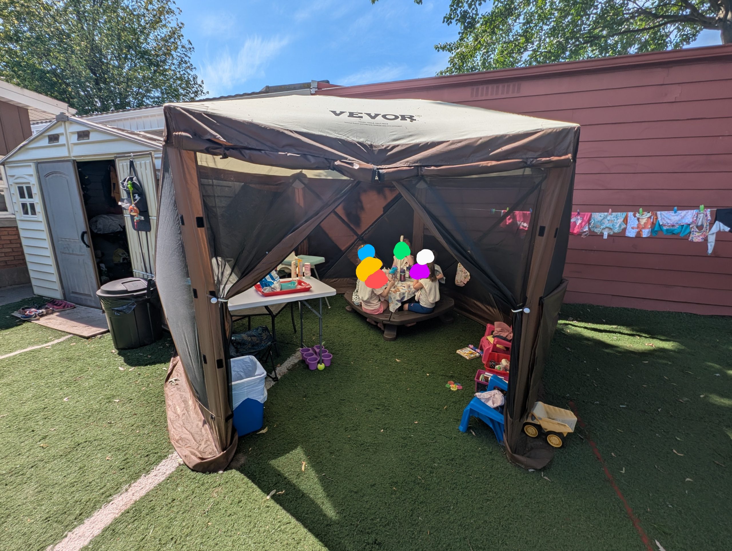En effet, Amélie nous partage qu’elle a organisé sa cour arrière en camping personnalisé pour les enfants. « Les amis passent la journée dehors; j’ai un endroit pour faire à manger à l’extérieur, un espace pour les jeux communs et même une tente pour que les enfants aillent aux toilettes! Chaque enfant a même sa tente pour faire la sieste lors des après-midi ensoleillés. Tout est pensé pour que je puisse fermer la nuit et m’abriter sous la pluie. », se réjouit-elle.