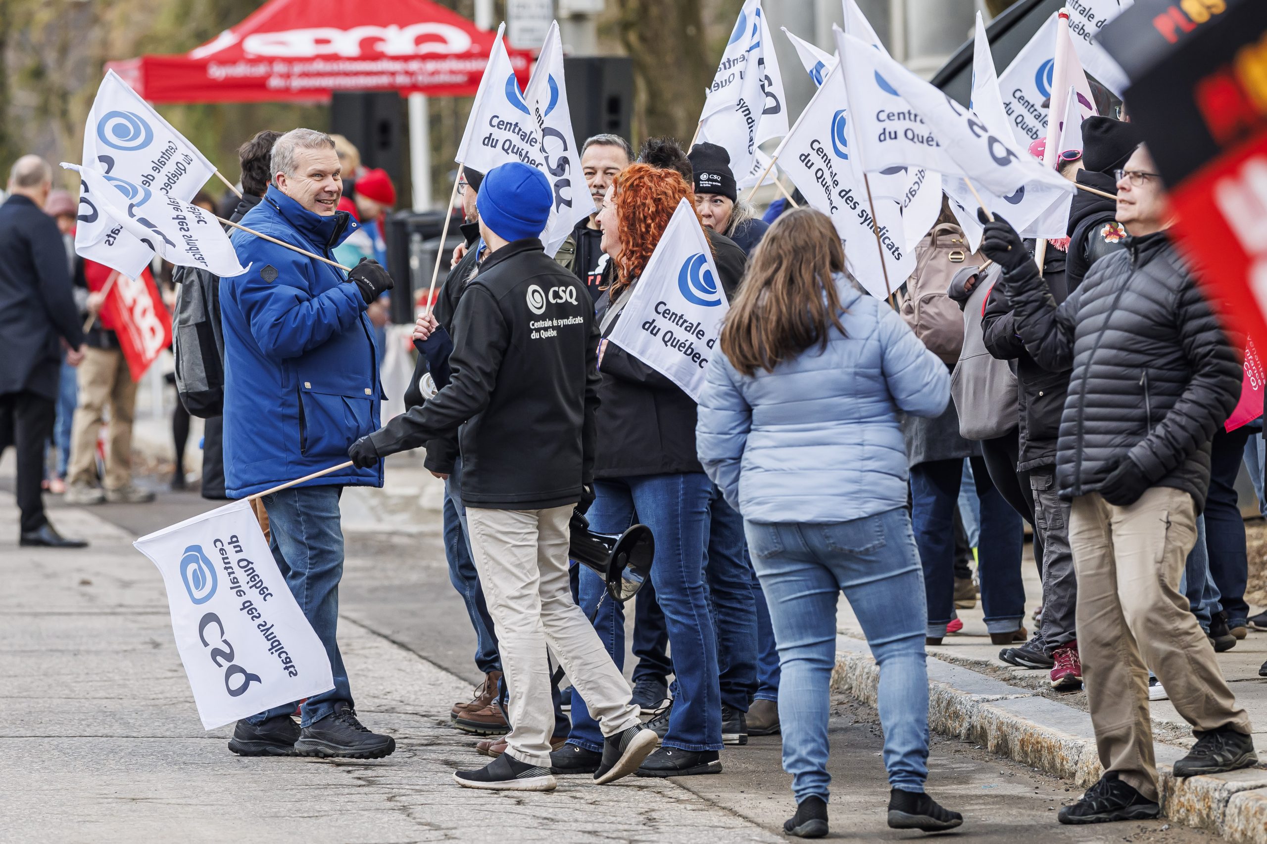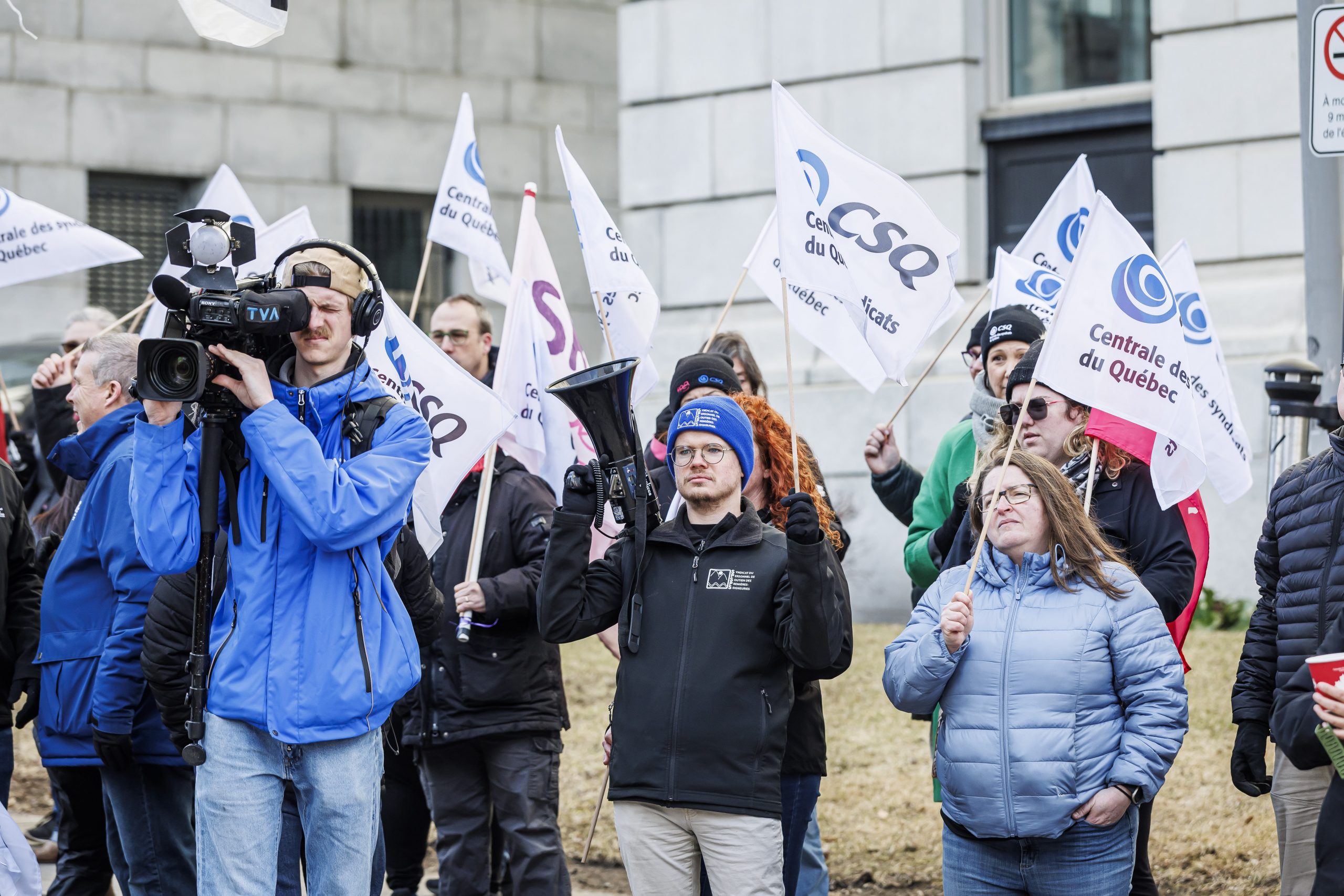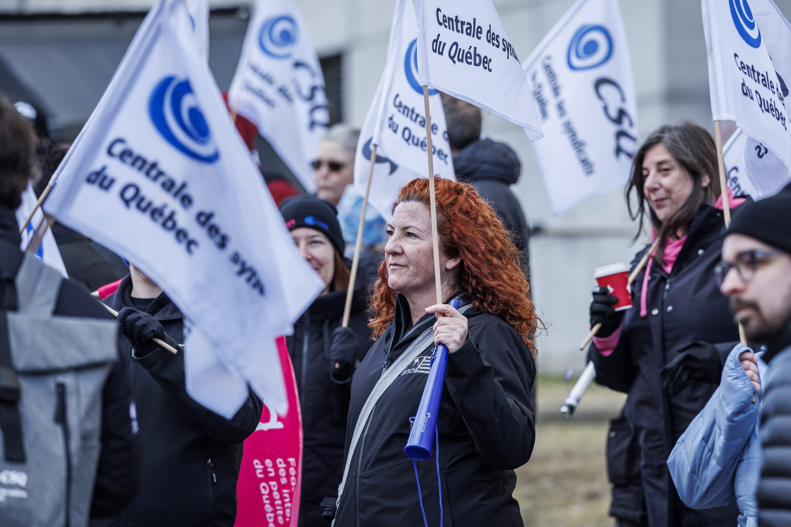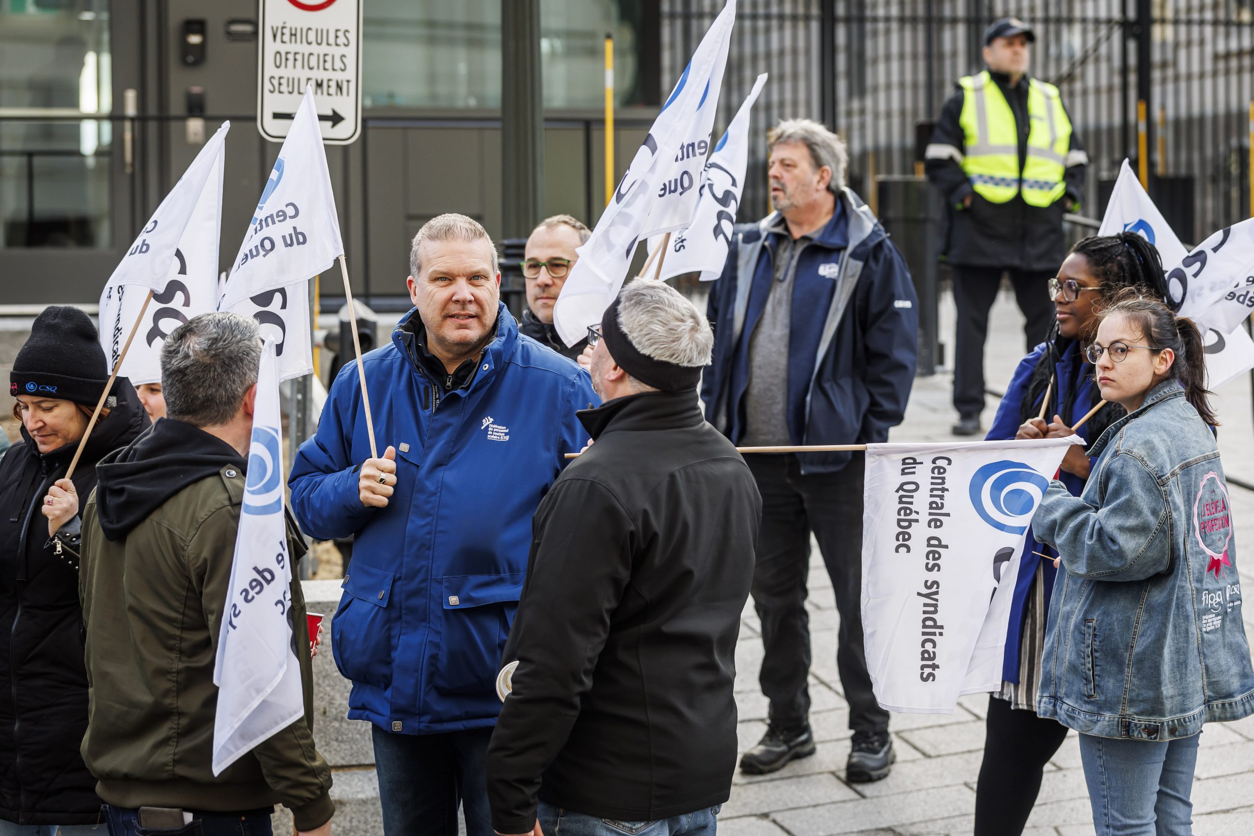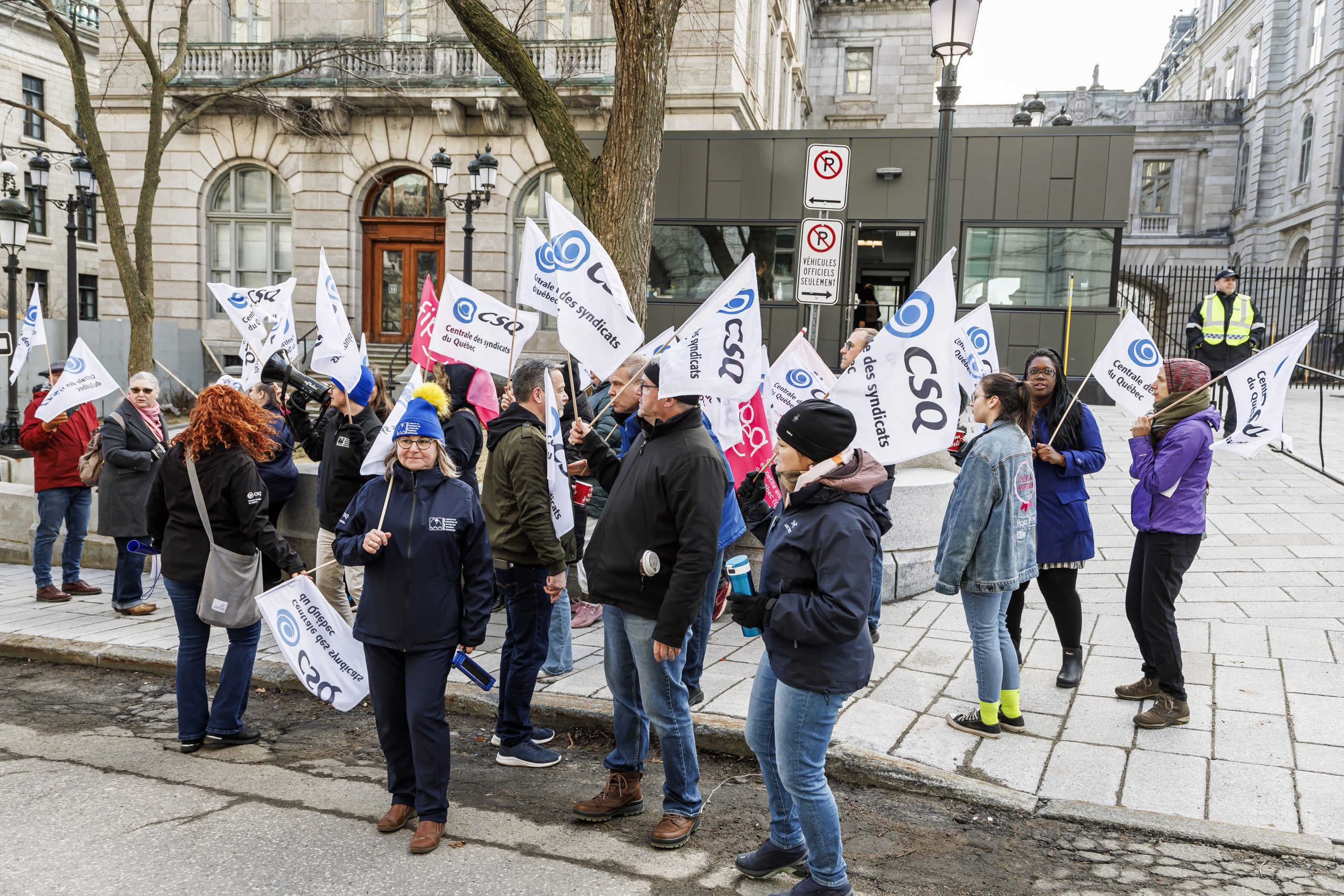 Les manifestantes et manifestants étaient présents, dès 7 h, pour accueillir les députées et députés à leur arrivée à l’Assemblée nationale. Drapeaux à la main, ils se sont fait voir et entendre des parlementaires dans le but de leur rappeler que le droit de grève est fondamental. Le gouvernement doit s’engager à reconnaître que l’équilibre de force actuel est l’objet d’un consensus social et qu’il doit le rester, encore aujourd’hui.