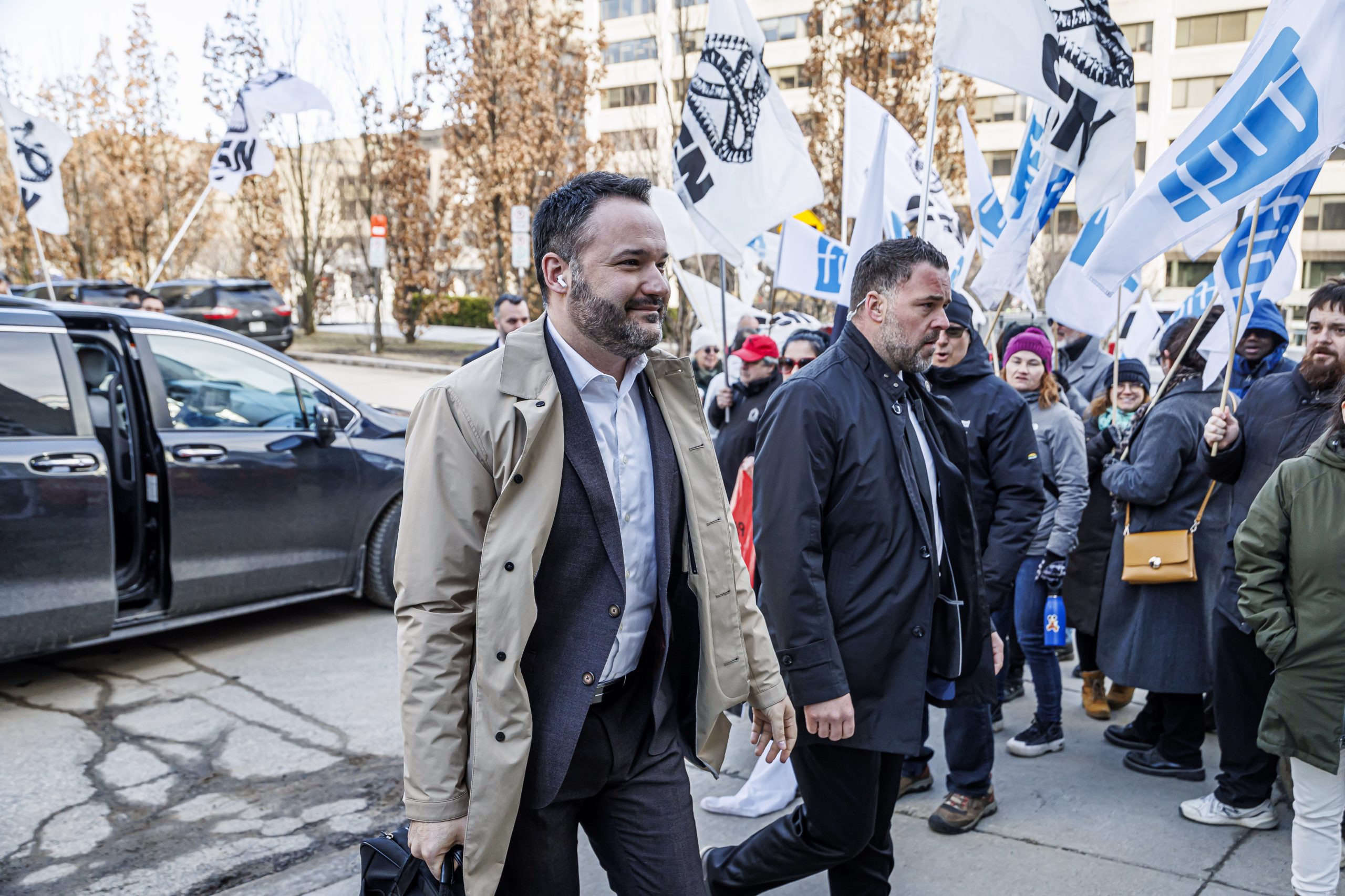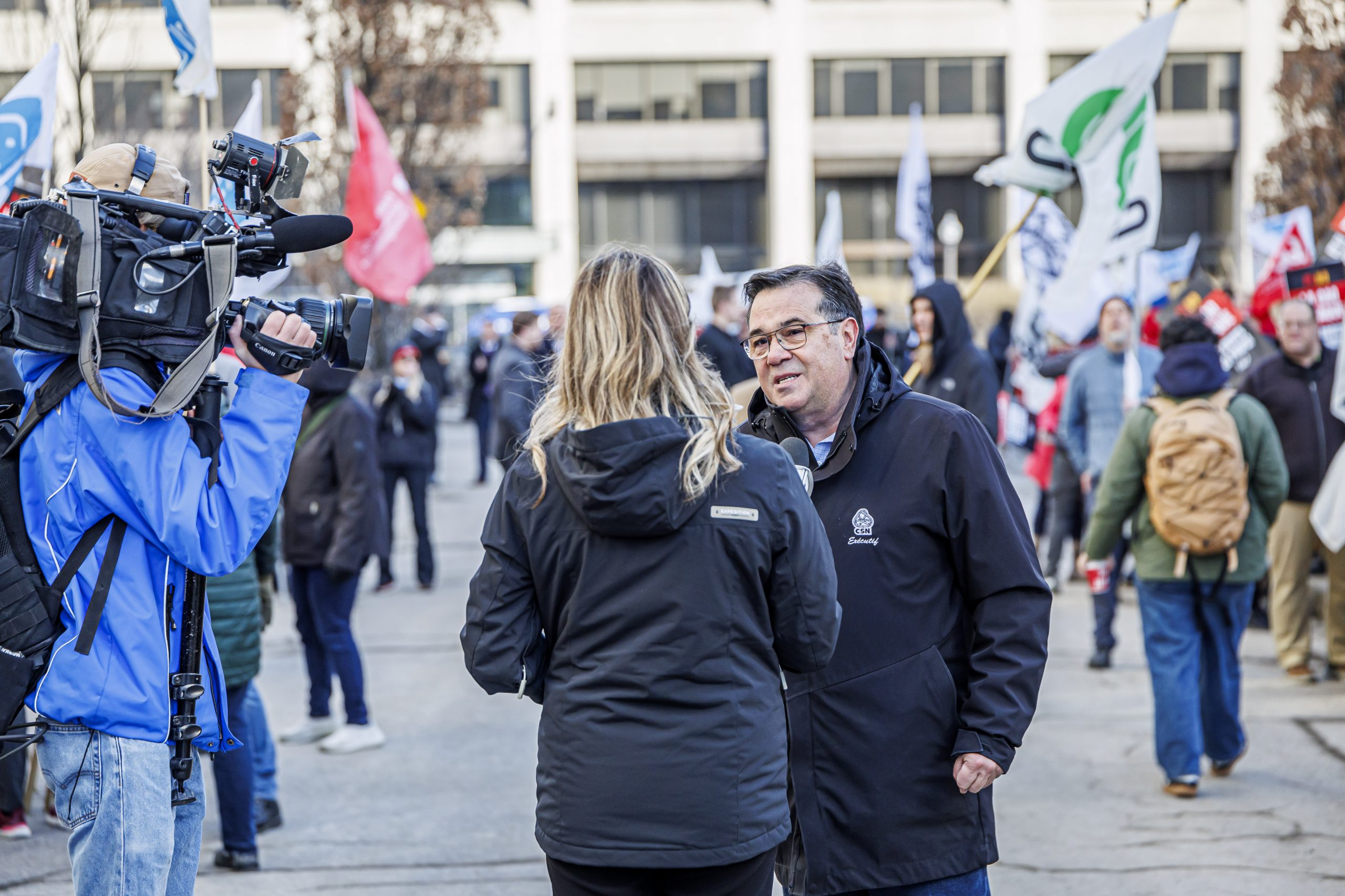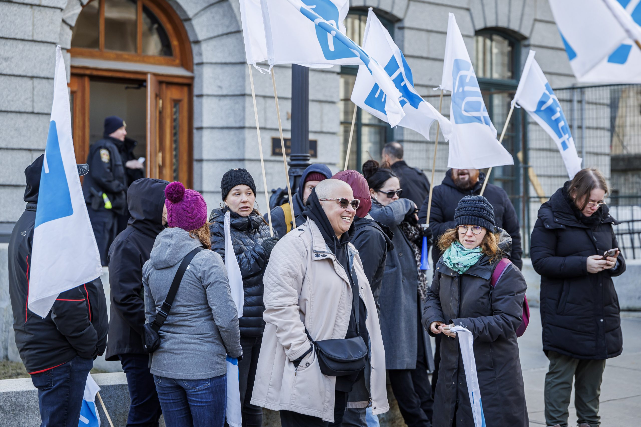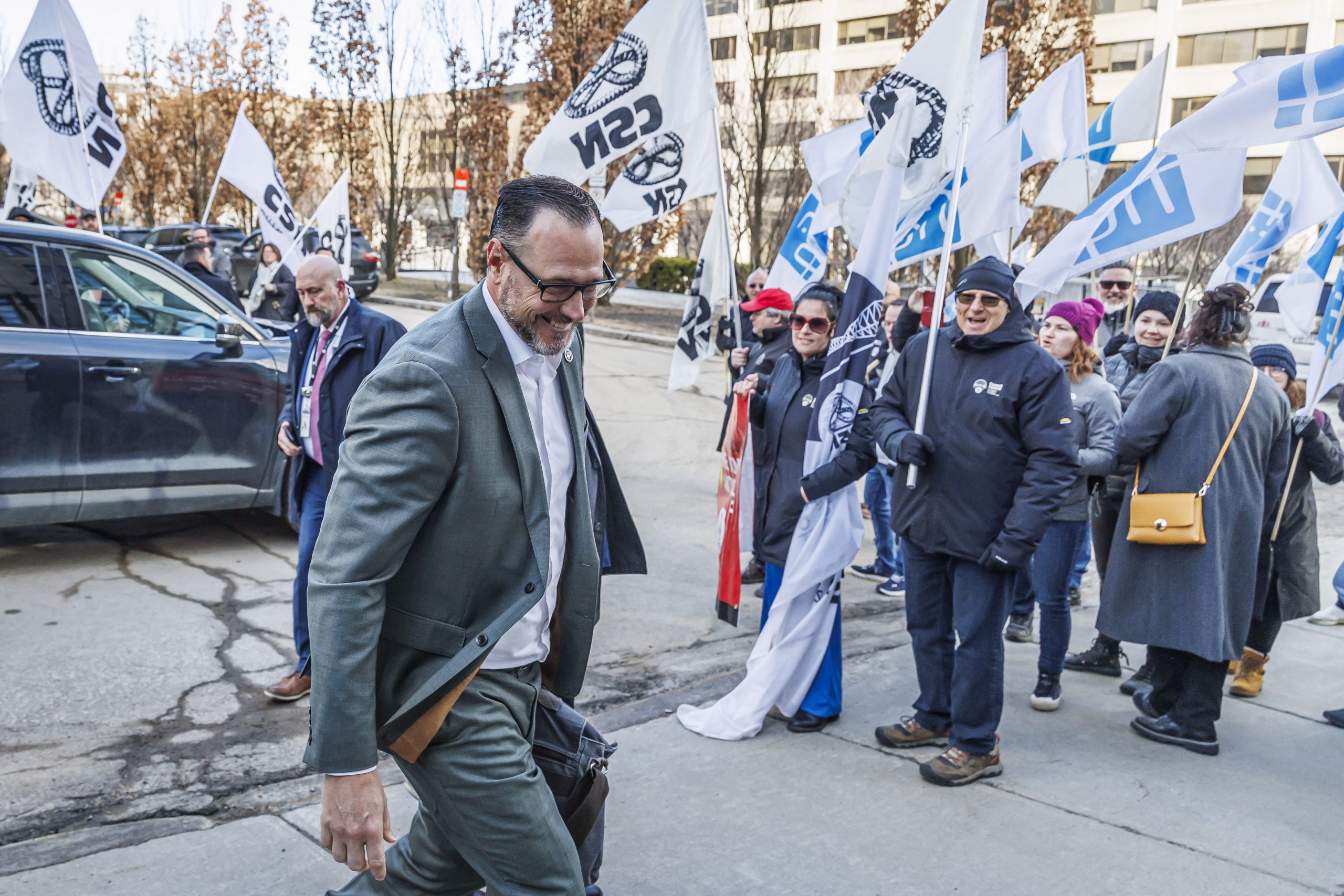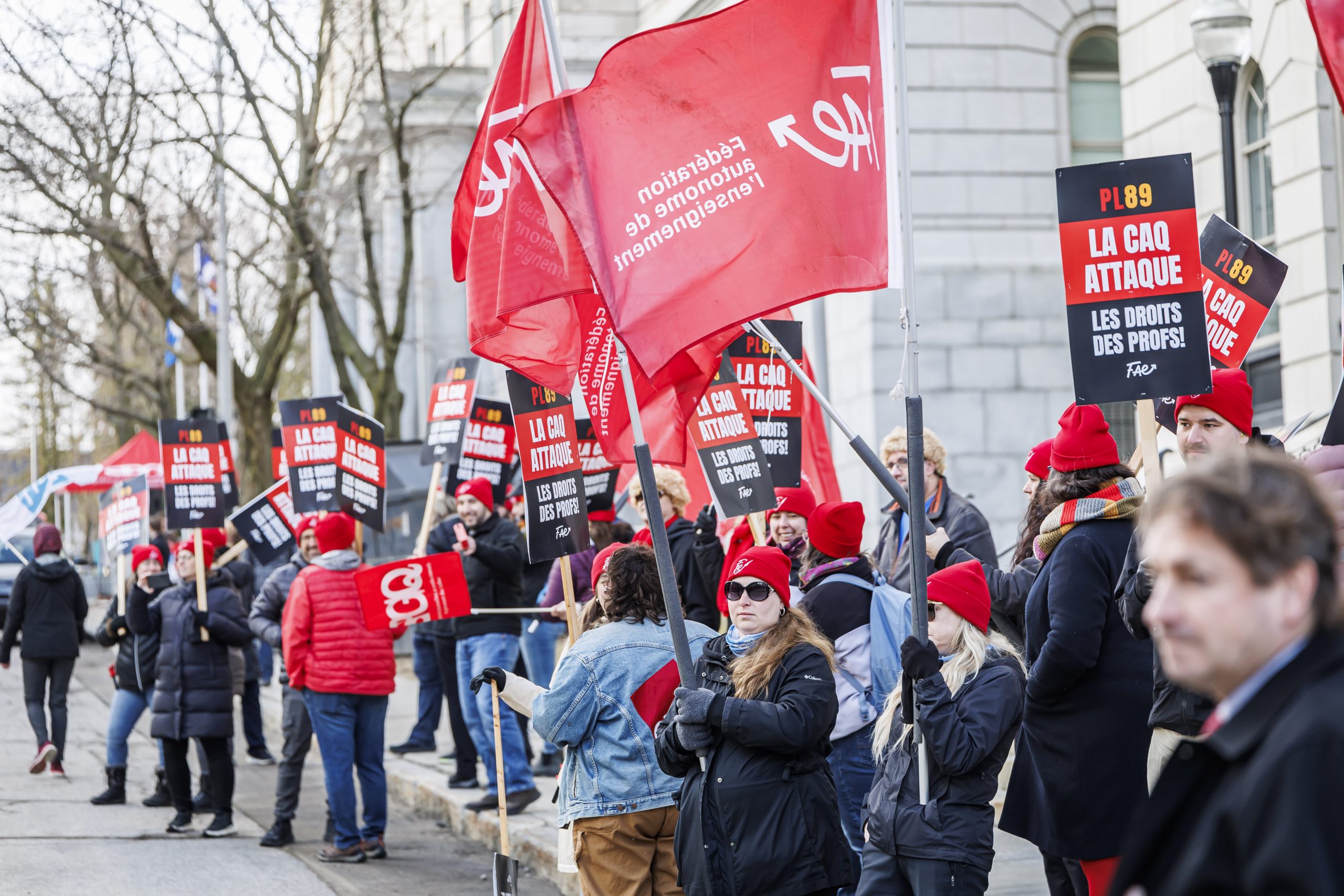 Les manifestantes et manifestants étaient présents, dès 7 h, pour accueillir les députées et députés à leur arrivée à l’Assemblée nationale. Drapeaux à la main, ils se sont fait voir et entendre des parlementaires dans le but de leur rappeler que le droit de grève est fondamental. Le gouvernement doit s’engager à reconnaître que l’équilibre de force actuel est l’objet d’un consensus social et qu’il doit le rester, encore aujourd’hui.