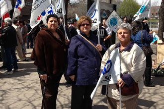 Montréal, le 30 avril 2013. – Environ 200 ouvriers spécialisés du secteur public ont manifesté aujourd’hui, à Montréal, pour accentuer la pression sur le Conseil du trésor afin que puissent se boucler les travaux, amorcés en 2010, sur les problèmes de rareté de main-d’œuvre dans les réseaux de l’éducation et de la santé et des services sociaux ainsi que dans la fonction publique. Ils désirent notamment que des correctifs salariaux soient apportés afin de combler les écarts grandissants entre les salaires accordés dans le secteur privé et ceux du secteur public.