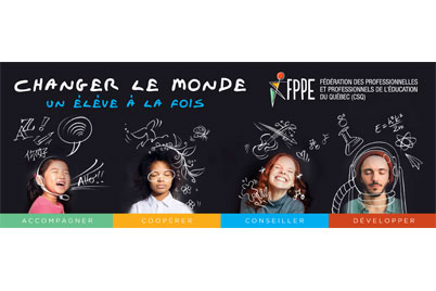 La FPPE-CSQ profite de la Semaine des professionnelles et professionnels pour lancer sa nouvelle image, un logo qui met l’humain au cœur de son design comme de son message, car l’humain est au cœur de l’intervention de la Fédération. Cet humain, professionnel ou élève, est en action, motivé, engagé vers un monde meilleur.