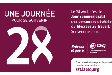 Dans le cadre de la Journée internationale de commémoration des personnes blessées ou décédées au travail, le 28 avril, la Centrale des syndicats du Québec (CSQ) ainsi que plusieurs autres organisations syndicales se donnent rendez-vous devant le bureau du premier ministre, François Legault, à Montréal, afin de souligner ce moment de façon solennelle.