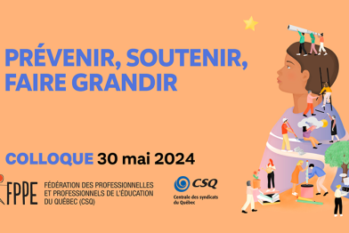 Pour la première fois le 30 mai 2024, la FPPE-CSQ a tenu un colloque hybride, en présence et en ligne, pour faire connaître, reconnaître, et réfléchir les services professionnels en éducation, sous le thème Prévenir, soutenir, faire grandir.