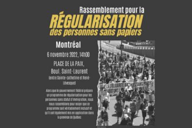 Trente organisations communautaires et syndicales se rassemblent, appuyées par de nombreux groupes et individus des milieux académiques, religieux et patronaux, pour réclamer la mise en place d’un programme véritablement inclusif visant la régularisation des personnes sans statut migratoire. Dans le cadre de la « Journée québécoise pour la régularisation des personnes sans statut migratoire », les mobilisations se déroulent à Montréal, à Québec, à Rimouski, à Sherbrooke et à Chicoutimi, où les organisations demandent aux gouvernements du Canada et du Québec de s’engager concrètement dans ce processus, et ce, en collaboration avec la société civile.