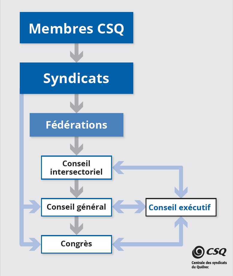 Le conseil général se réunit quatre ou cinq fois par année. La délégation de chaque syndicat affilié est établie au prorata du nombre de membres qu’il représente. Environ 300 personnes représentantes des syndicats, des fédérations, de l’Association des retraitées et retraités de l’éducation et des autres services publics du Québec (AREQ) et du Regroupement des Unités catégorielles (RUC) affiliés à la CSQ participent au conseil général.