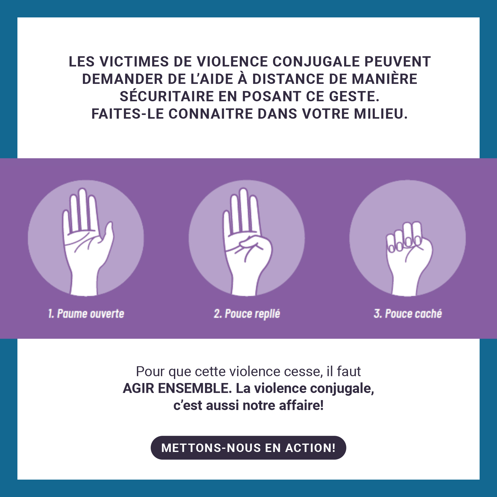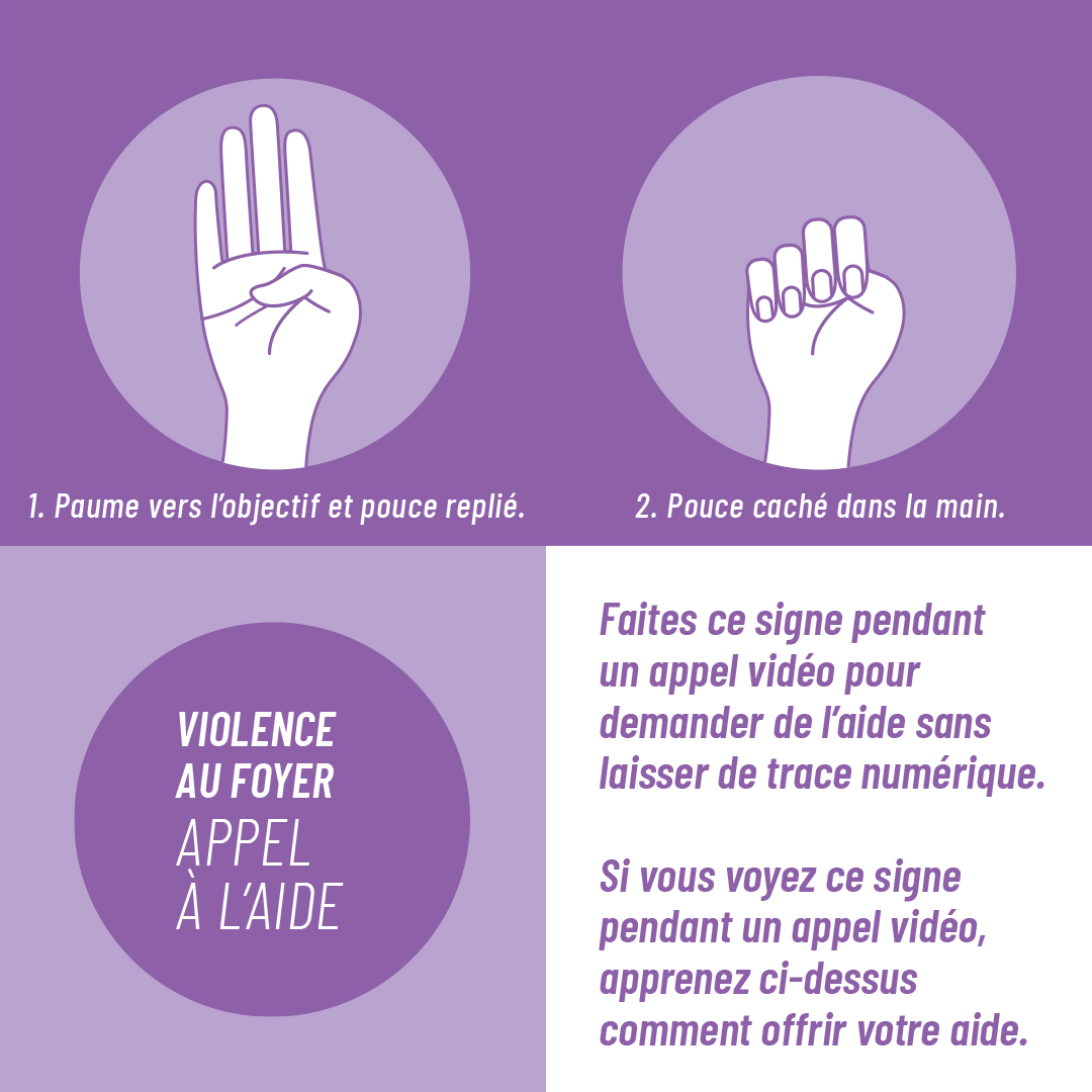 Pour plus d’information sur ce signe d’appel à l’aide, visitez le site de la Fondation canadienne des femmes.