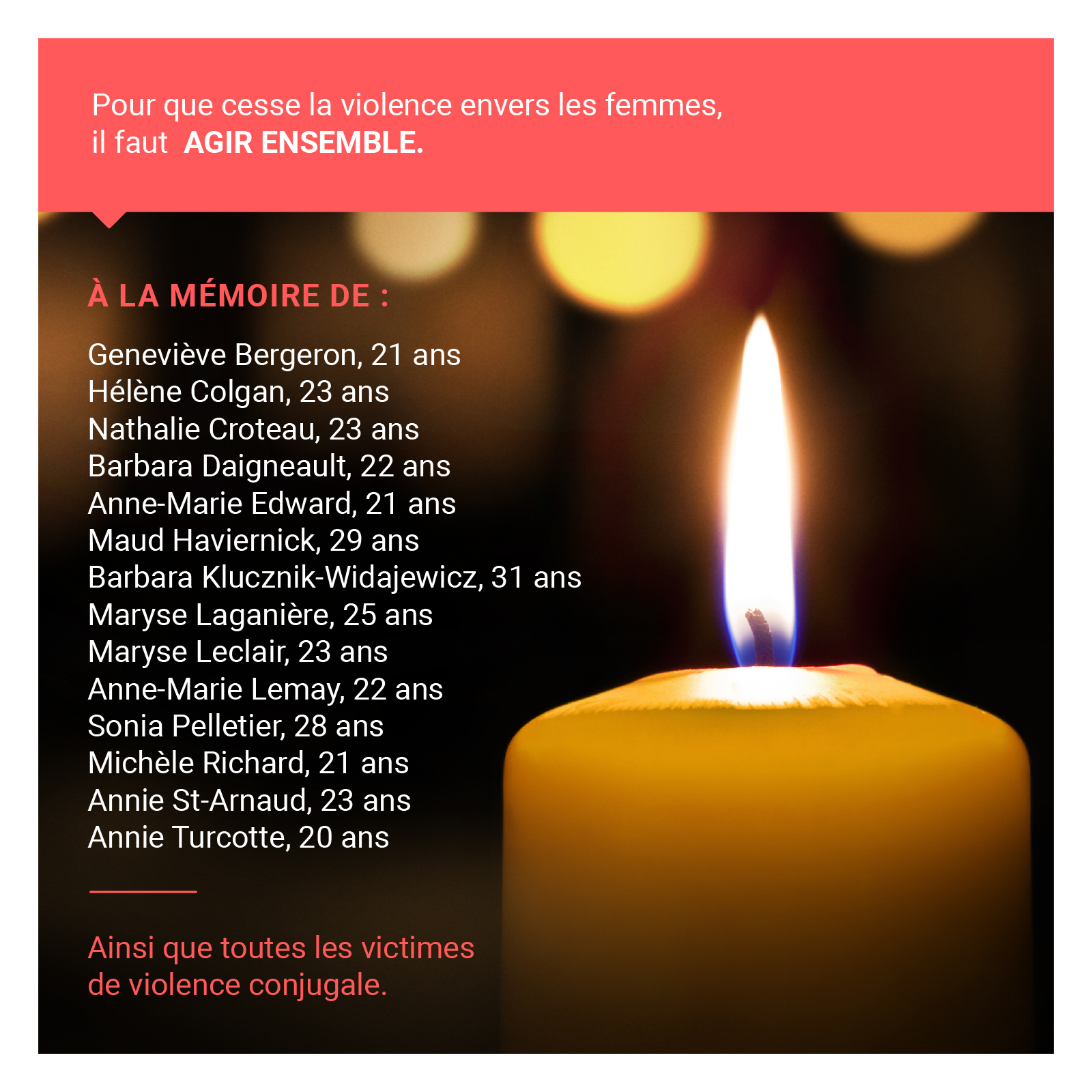 Quant au 6 décembre, Journée nationale de commémoration et d’action contre la violence faite aux femmes au Québec, il commémore le meurtre des 14 jeunes femmes de Polytechnique, commis en 1989. Plus de 30 ans nous séparent de cet événement tragique, où ces femmes ont perdu la vie pour la seule raison qu’elles étaient des femmes étudiantes visant des carrières à prédominance masculine.