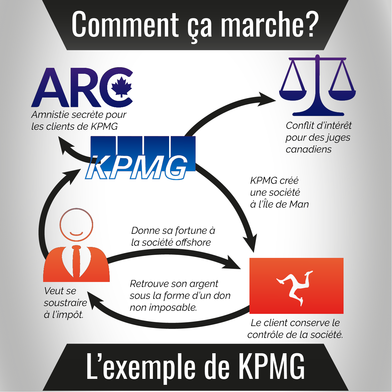 L’affaire KPMG a été révélée par Radio-Canada en 2016. Il s’agit d’un des plus graves scandales de fraudes fiscales au Canada. KPMG, une firme internationale d’avocats et de comptables, proposait à des individus fortunés un stratagème fiscal leur permettant d’éviter l’impôt au Canada.
