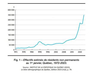 Cependant, c’est sur le plan de l’immigration temporaire que nous assistons à une véritable explosion du nombre de personnes immigrantes depuis quelques années. En 2022, elles étaient au nombre de 86 000, portant l’effectif total présent au Québec à 346 0003 au 1er janvier 2023 (voir figure 1).