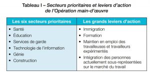 Dans son plan d’action, le gouvernement vise des secteurs prioritaires, ainsi que quatre grands leviers d’action (voir tableau I), dont nous décortiquerons les enjeux.