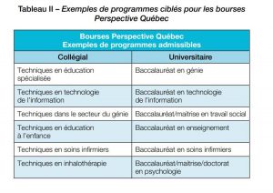 Le gouvernement récidive avec son Opération main-d’œuvre, cette fois en créant des bourses (programme de bourses Perspective Québec) de 2 500 dollars par session pour certains programmes universitaires et de 1 500 dollars par session pour certains programmes collégiaux (voir tableau II). De nouvelles bourses sont également offertes pour certains programmes d’études professionnelles.