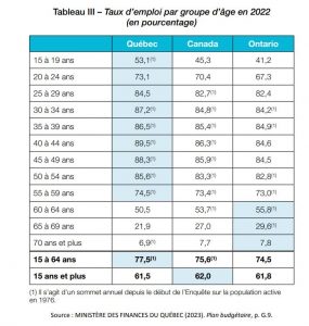 Dans le budget de mars 2023, le gouvernement a présenté un tableau (voir tableau III) qui appuie sa volonté de maintenir en emploi les travailleuses et travailleurs âgés du Québec.