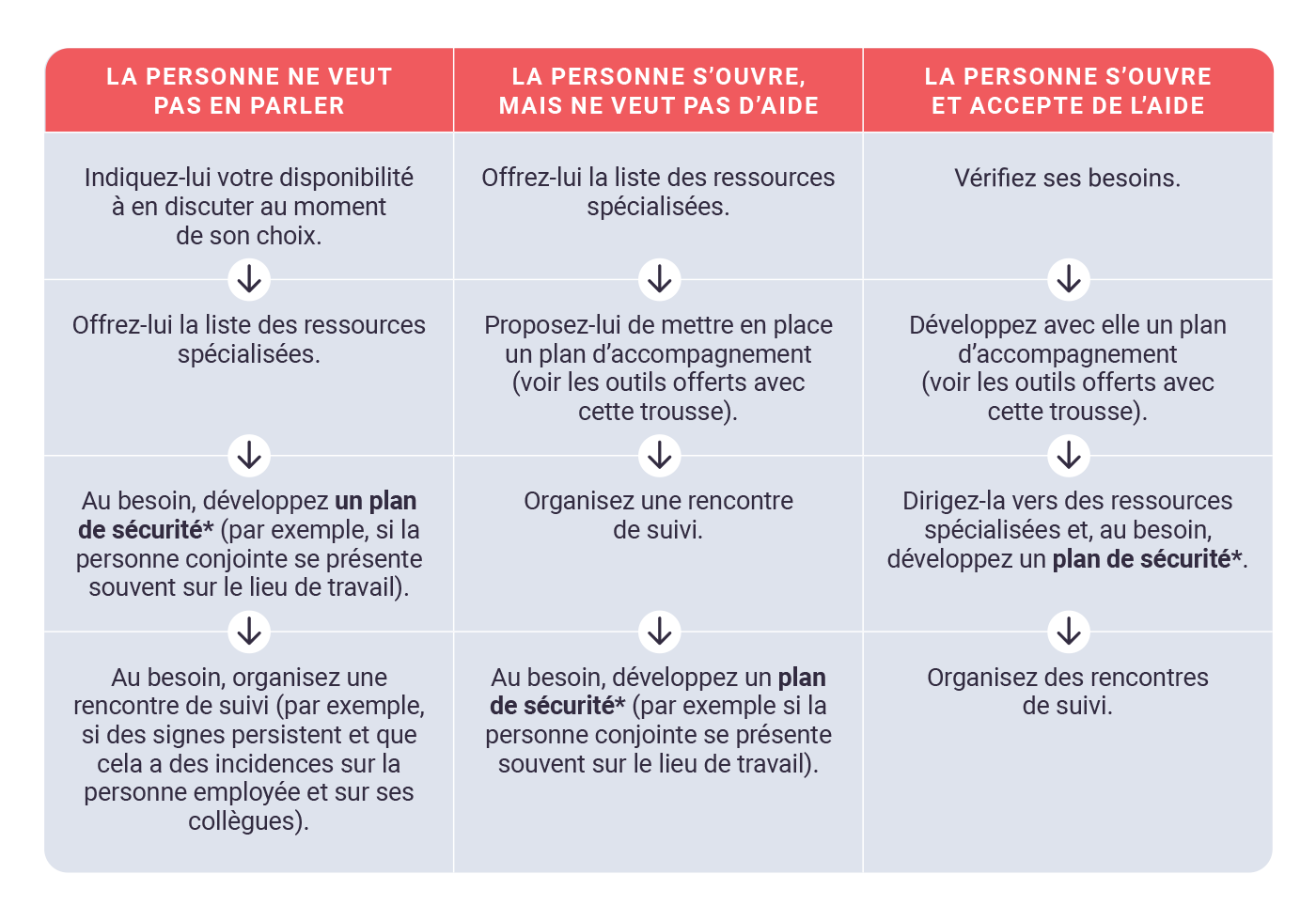 • Suivre des formations sur la violence conjugale et encourager l’employeur à en faire tout autant;